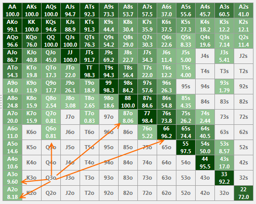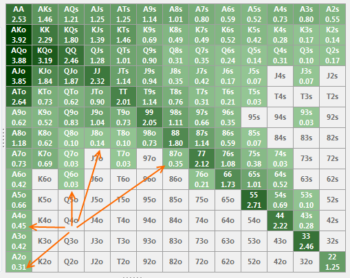 Что означают числа отмеченные оранжевым на картинках когда я выбираю репорт Holdem Hand Range Visualizer в статистике?
