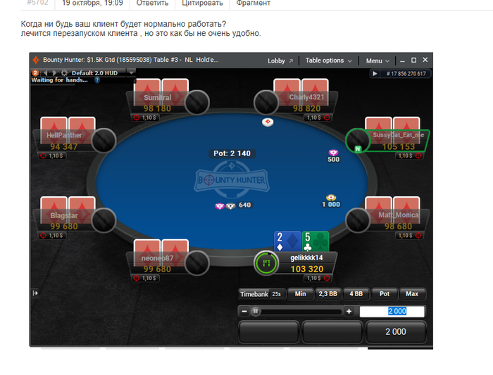 Вопрос к представителю пати , я зарегался в турнире заранее , ну и пока делать было не чего смотрел ютуб потом смотрю на время турнир уже идет минут 6 а стол не появился пока я не зашел в лобби и не нажал посадить меня за стол . так вот собственно сам вопрос ,долго эта хуйня будет продолжаться ? просто это уже не в первый раз (за мат извиняюсь )
