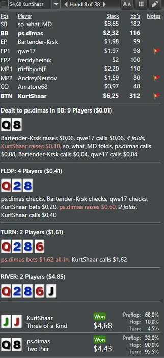А когда ваш винрейт всего 1бб / 100, угадайте, что? Такие руки тебя абсолютно похоронят. Тот, кто для сравнения выигрывает со ставками 10bb / 100 или 20bb / 100, может справиться с обычными бэд-битами намного легче.