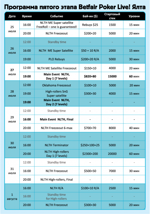 турнир по Оклахоме состоится 28-го июля в 12.00. Freezeout $100+10. 5000 стартовый стек, уровни по 20 мин. 27-го июля в 12 часов состоится дополнительный сателлит на МЕ. $150+10 Freezeout 4000 стартовый стек, уровни по 20 мин.