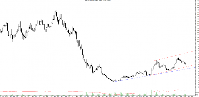 Ну, чтобы нам тут Мэрфи рассказал. Омном-ном-ном восходящий тренд - синия трендовая. 4-ое касание не дотянули, передвигаем трендовую, теперь красная, проверим силу параллельной. Внимание! не дотянули до предполагаемого верха канала, идём к красной трендовой, но там надо быть осторожней, сила тренда под вопросом. Возьмите все индикаторы, осцилляторы, скользящие и прочую хуюту, коим набита моя книга (в особенности последнее издание), и в 50% из них, вы увидите, что силу тренд теряет) Балансовый объём внизу показывает, что лонги растут, а цена падает. По Мэрфи покупать на недельках рано. Шортить до ~45$ и возможного прорыва ниже до синей, гм... Возможно, но необходимо смотреть ниже, и пока стопы слишком высоки для шорта. Но идея уже есть. Лонг - нет. Шорт - возможен.