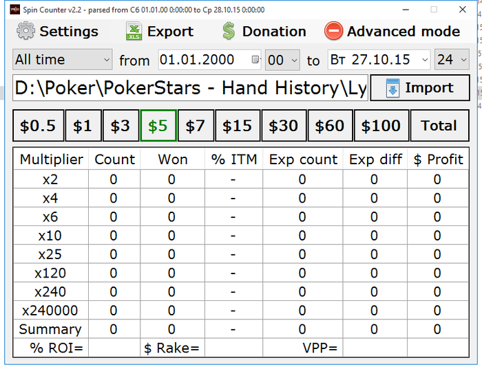 Что-то не понимаю. :( Указываю кнопкой "Import" папку с Hand history, там 68 файлов формата "HH20151027 T1360860160 No Limit Hold'em $4.65 + $0.35.txt" и файлов 20 хистори зума.