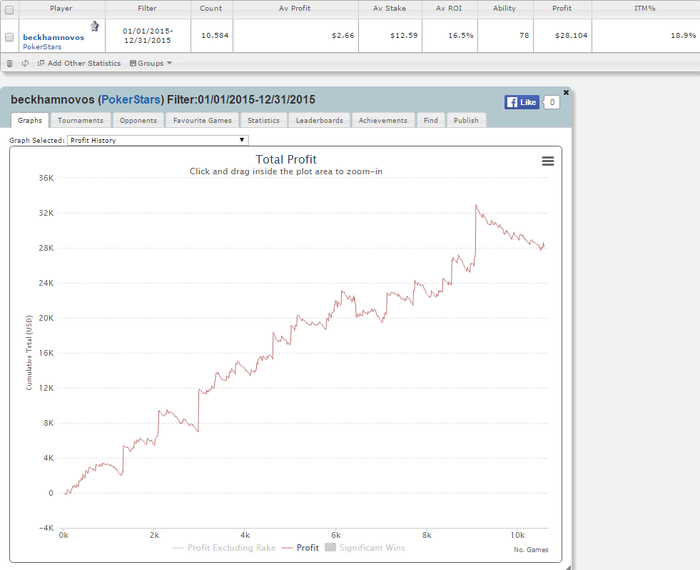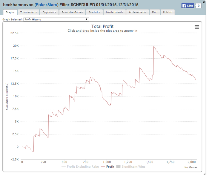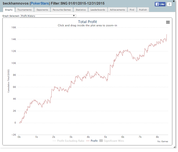 Немного циферок и графиков с 2015г.:В целом год отличный, за исключением декабря, что-то в конце я наминусовал. А так вернулся в покер и закрепился на средних лимитах, попробовал себя в оффлайн, этот год занял второе место по профиту в моей карьере.