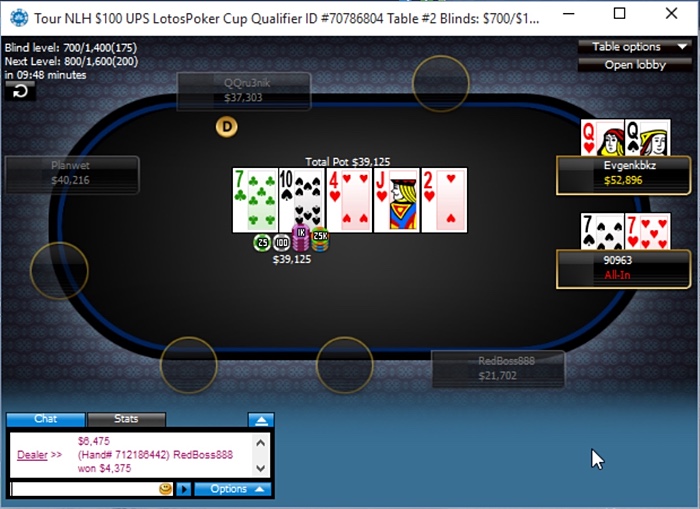 Еще одна небольшая пауза имени серверов 888, - и игра возобновилась. Всего за несколько раздач отправились на отдых три коротыша - "diler001", который поднялся чуть ли не с нуля, и стремительно растерявший стек "luvzen". Более жестких переездов давно не видел - казах растерял 40-тысячный стек в три раздачи.