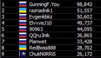 Серьезно поправил свои дела "razriadnik1" (52К). Он убрал симпатичного "MAMAHTEHOK", деловито вырезав оппонентов с , и обыграв .