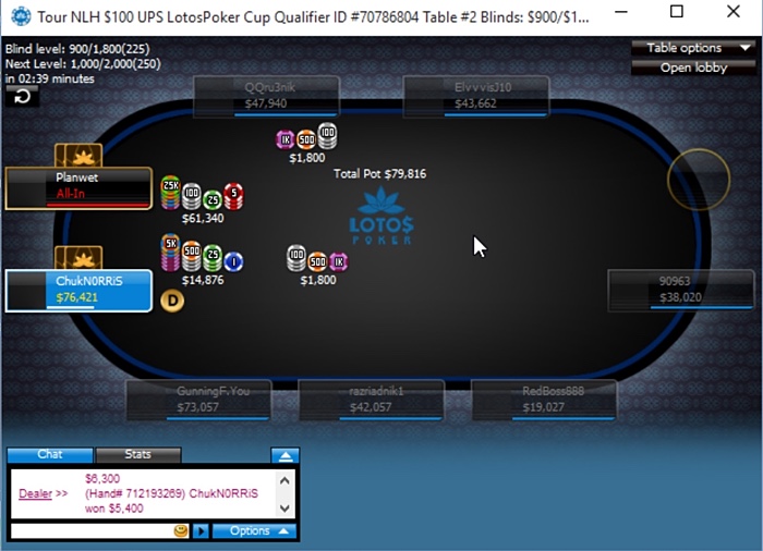 P.S. Пока самый активный за столом - "ChuckNORRIS", который сумел наколотить без вскрытий уже 72К+. Он же только что исполнил первый 3-бет.