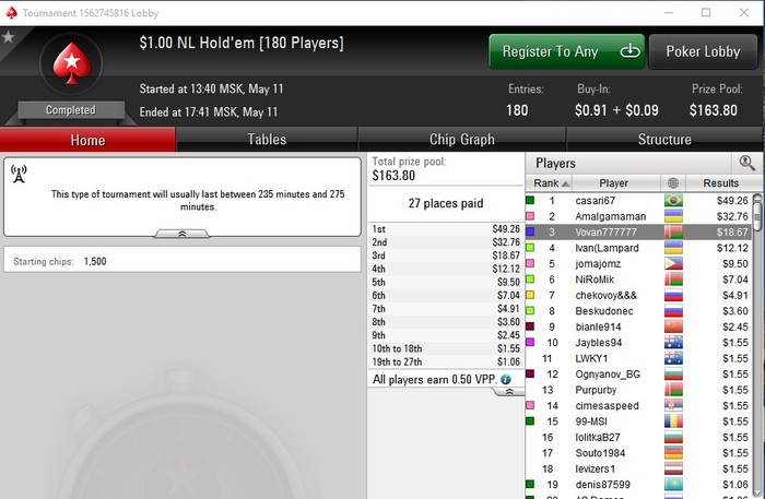 3:08 утра... еще не сплю... сыграл 3 СНГ по 0.25 на 45 чел... Один выиграл Вроде бы начало марта обнадеживающее... Плюсуем... Теперь можно и лечь поспать....