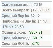 Цели: 1)1500 турниров (45макс, остальные не в счет) - а я помечу эту цель выполненной, хоть и штук 200 не дотянул, но при этом сыграно около 1.5к сатов 2)Получить статус SilverStar - выполнил с запасом, хотя месяц назад цель казалась недостижимой - растем 3)Банкролл 150$ (Только в этом случае перехожу на 1.5$, не раньше) - вот тут не дотянул из-за кэшаутов, но на 1.5 я все-таки перейду