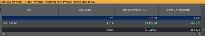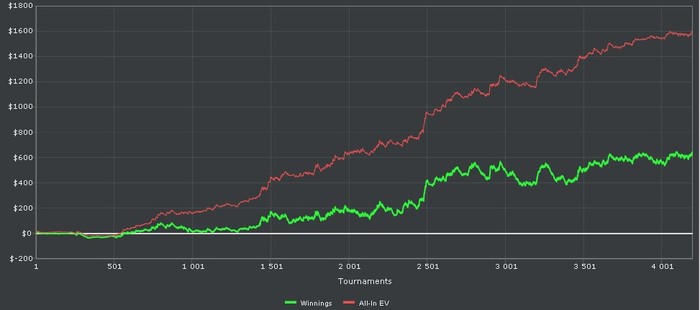 Уже в ноябре перешел на семерки 63 фишки, по ев ровно столько же сколько и по факту (+1130$)