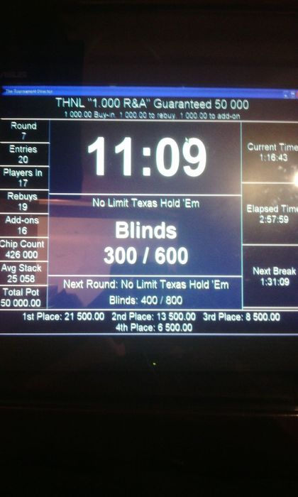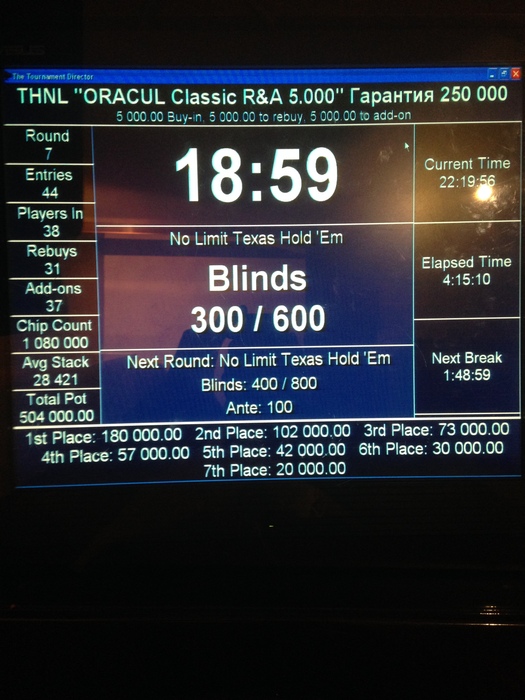 Ну что же друзья дневной турнир по 10.000 ReEntry конечно не состоялся по известной причине, ну а внеплановый вечерний R&A по 3.000 руб хоть и с трудом но превысил заявленную гарантию в 150.000 руб.