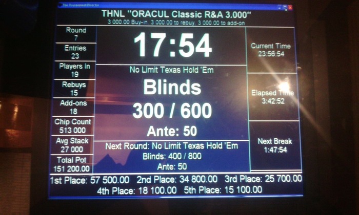 18:00 Турнир Classic R&A по 5000 Гарантия турнира 250 000 _ стартовый стэк 7 000 _ стэк на Rebuy 7 000 _ стэк на Addon 15 000 _ поздняя регистрация и Rebuy период 6 уровней _ длительность уровней по 6*35/30 мин