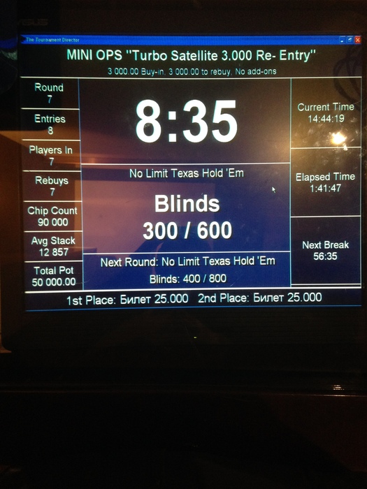 14:00 турнир Re- Entry по 10 000 руб Гарантия турнира 300 000 руб _ стартовый стэк 15 000 _ стэк на ReEntry 15 000 _ поздняя регистрации и возможность сделать ReEntry в течении первых 8 уровней _ длительность уровней 8*35/40 мин