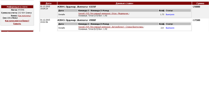 03.12.2015 47.ЛИНИЯ. Хоккей. КХЛ. Регулярный сезон Ак Барс - Йокерит Вторая не проиграет Х2 : 1.75 Сумма ставки: 5000