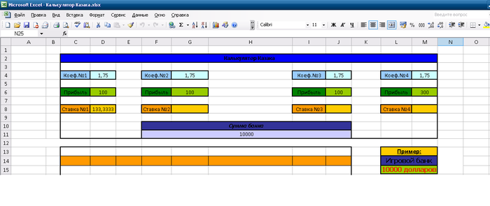 CossacksA @ 2.12.2015 б) Дальше выделяю следующих 90% от выделенного игрового банка для ставок в режиме лайв. Уже много раз упоминалось до меня и мною, что без выделенных целей и стратегий не стоит вообще открывать сайт БК или идти в "будку". Соответственно я не отношусь к тем "горе-капперам" которые обещают за 24 часа 1 млн и т.д. Я скорее более скучный и не интересный каппер для многих "любителей" ставок. Т.к. моя деятельность основана на регулярном наблюдении для многих не интересных матчей, много статистики, цифр т.е. математики и прочего. И доход составляет от 5 до 20% к общему банку . Некоторым говорил что до 50% за рабочий день , имелось в виду к банку стартовому на текущий рабочий день. Дальше, ставлю исключительно по калькулятору выбору ставок, найденного на просторах интернета и усовершенствованного мною лично. Он в Экселе, из-за моего далекого настоящего от программирования . Как выглядит он прикрепил фото. Суть в том что есть фикс прибыль, которая закладывается в стартовый банк для лайва. Все что выше (из-за больше кф не по шаблону или винстрика длинного) уходит в страховочный банк. . Страховочный банк служит для того, если есть форс мажорные ситуации в плане скудности линии, или халтуры и пропуска игрового рабочего дня - он сможет восстановить и отбить все что было упущено. СОВЕТ никогда не начинайте без страховочного банка.!