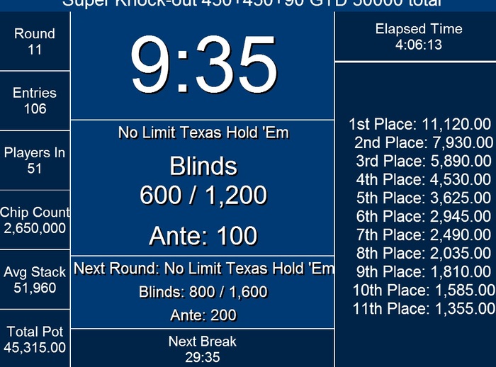 3. В турнире Knock-out добавлены еще 2 раунда поздней регистрации и ре-ентри(в связи с большим количеством желающих а количество столов под турнир на 2 меньше заявленного)