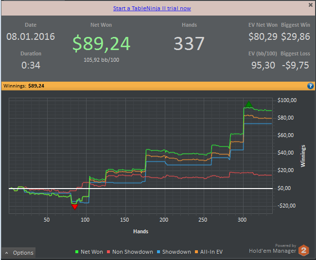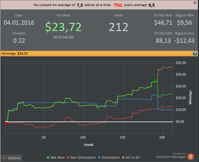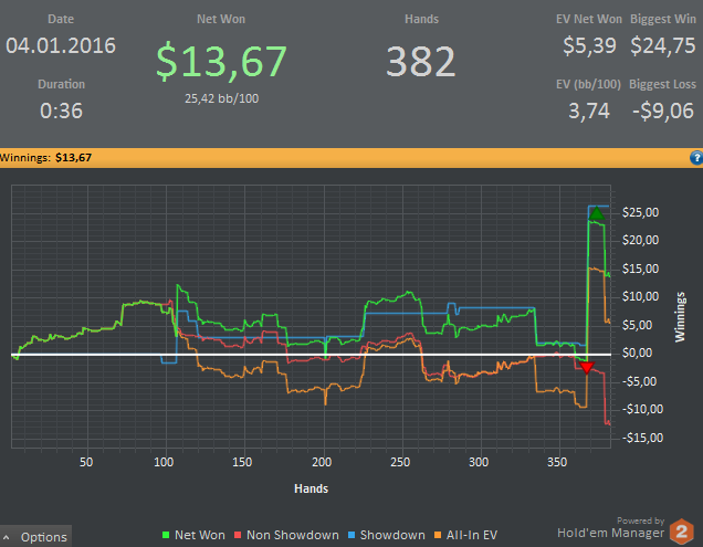 встал довольно поздно , решил посмотреть есть ли игра ,к моему удивлению столов было на так уж и мало , плюс я ещё штуки 3 стартонул , играл до последнего . Пока столы не развалились ,пока буду играть не выше нл25 ,надо восстановится после праздников