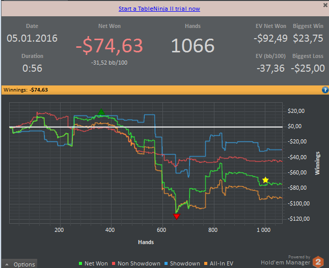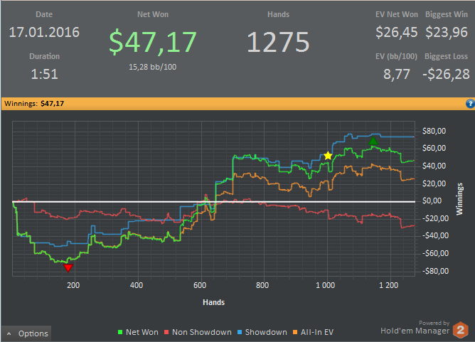 1) Дата 17.01.2016 2) результат день 166.97 3) кол-во рук 4859 4) Время потраченное на игру 6ч45минут 5) Концентрированность на столах 8 6) Качество игры 8 7) Ошибки 8 8) Тильтоустойчивость 9