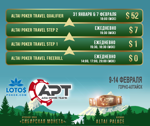 Мы рады возобновлению сотрудничества с Altai Poker Travel в перспективе предстоящего этапа серии в феврале! Уже послезавтра в лобби LotosPoker появятся онлайн-сателлиты, в которых мы планируем разыграть как минимум два пакета на Main Event. Каждый из пакетов включает в себя бай-ин на главное событие серии за 30,000р + 2 дневное проживание в гостинице "Ая".
