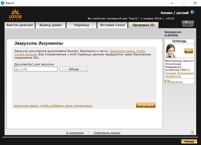 1. После регистрации мы настоятельно рекомендуем верифицировать свой аккаунт, загрузив скан официального документа (паспорт РФ или водительские права) во вкладке Проверка ID в кассе клиента:
