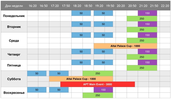 «Шаг 1». NL Hold'em. Бай-ин - 50 руб. Стек - 1,500. Уровни - 5 мин. Ребай неограничен, эдон после 6 уровня. Призы - билет на «Шаг 2», сдача - баббл-бою* «Шаг 2». NL Hold'em. Бай-ин - 250 руб. Стек - 2,000. Уровни - 5 мин. Ребай неограничен, эдон после 6 уровня. Призы - билет на «Шаг 3»**, сдача - баббл-бою «Шаг 2+». PL Omaha. Бай-ин - 150 руб. Стек - 2,000. Уровни - 5 мин. Ребай неограничен, эдон после 6 уровня. Призы - билет на «Шаг 3»***, сдача - баббл-бою «Шаг 3». NL Hold'em. Бай-ин - 1000 руб. Стек - 2,000. Уровни - 10 мин. Два ребая, эдон после 6 уровня. Призы - билет на Altai Palace Cup (10К), сдача - баббл-бою «Шаг 4». NL Hold'em. Бай-ин - 3000 руб. Стек - 3,000. Уровни - 10 мин. Два ребая, эдон после 6 уровня. Призы - билет на APT Main Event (30К), сдача - баббл-бою