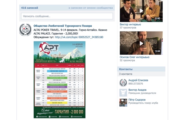 В Горный Алтай на несколько дней серии собирается прибыть президент ОЛТП Андрей Елисеев, причем не один, а вместе с командой лучших игроков Общества. Вы скажете, далековато из Питера, - но для них нет ничего невозможного. Ну и, конечно, вы обязательно столкнетесь с ними в сателлитах на APT - как в PokerStars Home Games, так и на LotosPoker. Их будет много, их практическую силу вы скоро почувствуете на себе. Только в официальной группе вКонтакте их почти две тысячи.