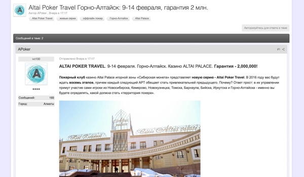 Благовест о нашей серии дошел и до южных границ Сибири, проник в Казахстан. Вчера на одном из его крупнейших покерных сайтов появилась копия нашего анонса, а уже скоро информация о нем попадет и на главную страницу poker.rz. Из разговоров с представителями сайта стало ясно, что интерес к серии у казахских игроков есть, и нешуточный. Они готовы начать с сателлитов на LotosPoker, которые стартуют в субботу, а если не выйдет отобраться, продолжить попытки уже в Altai Palace.