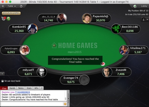 Вскоре как-то незаметно образовался финальный стол... за которым по раскладу надо было "пересидеть" как минимум двоих. Стоит обратить внимание, что несмотря на структуру гипер-турбо, у чиплидера "Papamish@" было целых 100 ББ, у самого же короткого стека, "Vitalina271" - ни много ни мало 17. Можно играть.
