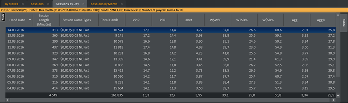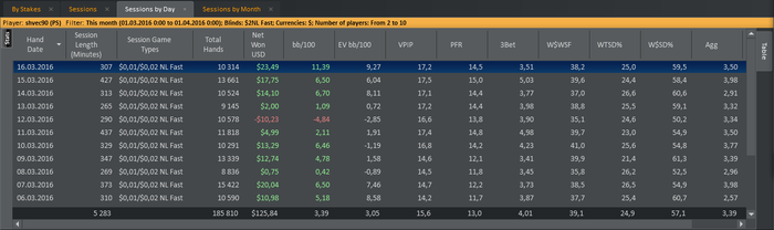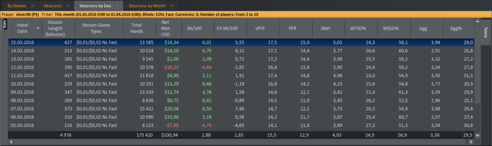 Привет, 8 столов зума, играю по разному, но в основном 2 сессии утром по 2 часа, а остальное доигрываю вечером. Ожидание изначально было 3бб/100, но что-то пошло не так и если закончу 2бб/100 тоже будет не плохо.