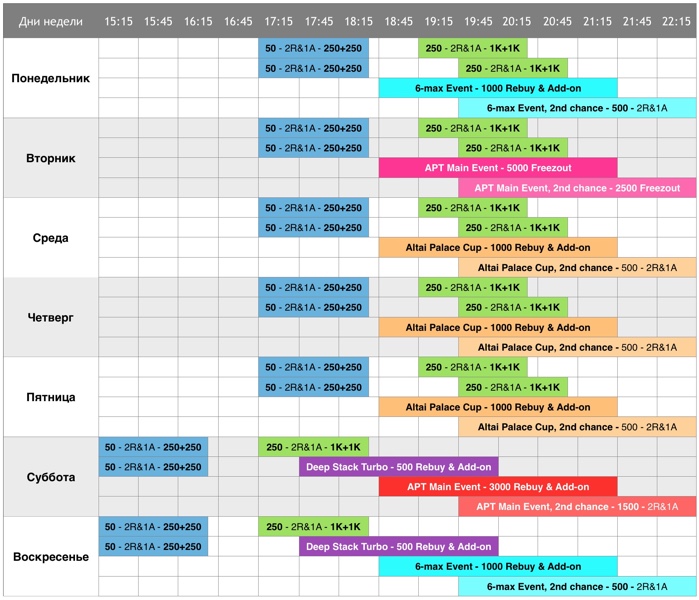vlad0512 @ 4.3.2016 приветствую! ЦИТАТА С ПЕРВОЙ СТР.: Каждый день будут разыгрываться билеты в различные турниры APT - Deep Stack Turbo (по 500), 6-max Event (1000), Altai Palace Cup (1000) и Main Event (3000 и 5000 freez). КОНЕЦ ЦИТАТЫ.