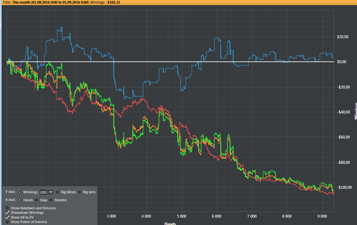 EV bb/100 = 2.5 приемлемый для начала, я вроде более-менее привык к текущему стилю игры, и, возможно, буду играть больше столов, сейчас я играл не больше 6. Лузрейт по красной -7.5 bb/100, тоже нормально (это меня, если честно, радует больше всего, в последнюю попытку игры на нл10 я заливал -14). Было дофига раздач, где более оптимальное решение найти было в моих силах, но, я этого не делал, по разным причинам, в том числе, из-за тильта, из-за невнимательности, усталости, упёртости.