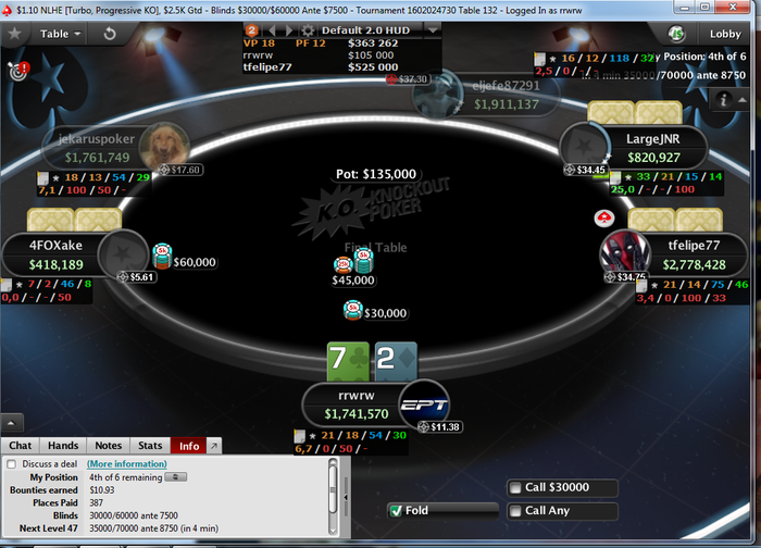 Странная сессия сегодня,совершил столько непонятных действий, с парой карманных дам поставил кон бет в треть стека соперника, на флопе был туз, он уравнял,ну я точно знал что там туз,и я терном запихнул алл ин.Зачем???С королями колировал два оупен рейза ,и выбрасывал на флопе с тузом,больше месяца не делал перерыв,каждый день играю,нужно проветрить мозг При этом всем, отыграл не в минус.В последнем турнире сижу в призах,чем выше пройду тем больше выиграю.