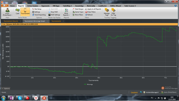 С первого июля вообще не работал над игрой, было некогда((( По итогу откатал сегодня -30,тем самым слил весь рабочий банкролл,вообще не хочу депать с карты,там осталось кеша ровно до конца лета. В принципе за последние 3 месяца я выиграл среднюю зарплату за 3 месяца. Чет я переосмыслил узнав из внутри эту кухню,никогда больше не буду стремиться сделать покер к единственным источником дохода. Тем самым ты перестаешь развиваться в других направлениях и самое главное ты перестаешь получать удовольствие от игры. Но и никогда не перестану играть и развиваться в этом направлении. Ну и график мой с первого дня с работы с Холдэм Менеджером
