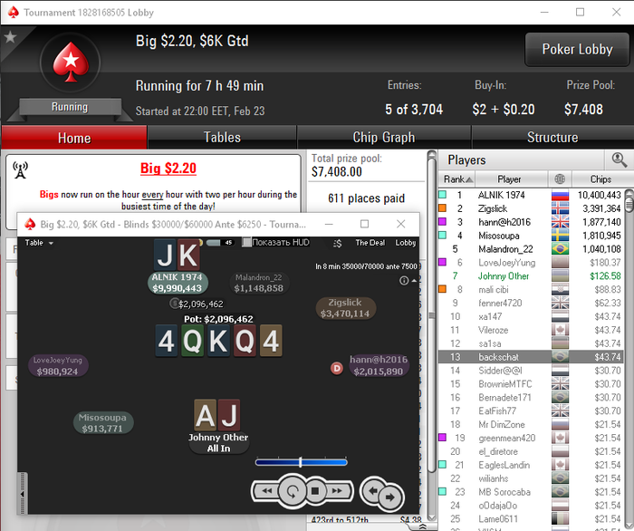 Наконец получаю первых АА за день алкоагрик ставит рейз 4 ББ, я пушу почти 500к, инста колл КК, флоп с А - удвоение. Стэк стал 1120К. Прохожусь по столам - по ходу я чипак.