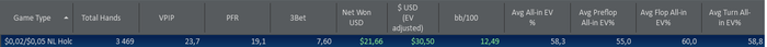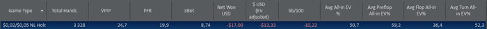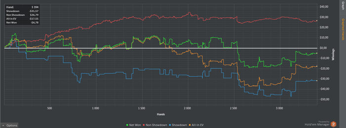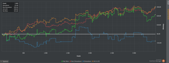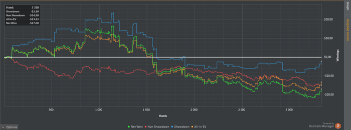 Техника: 1. Попробовал отыграть агрессивней пост-флоп дабы красная была возле 0 или в +, но понял что правду люди говорят о телефонах и тд и тп. 2. Игра с музыкой не для Меня, нужна полная концентрация. Психология: 1. Меня сильно огорчает когда красная линия идет резко в низ, но походу нужно с этим смириться.