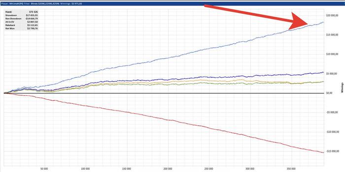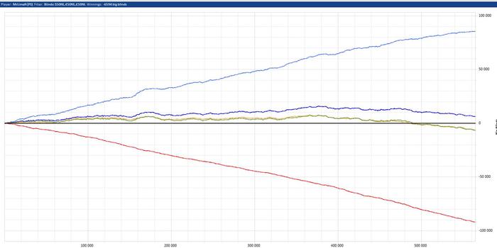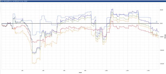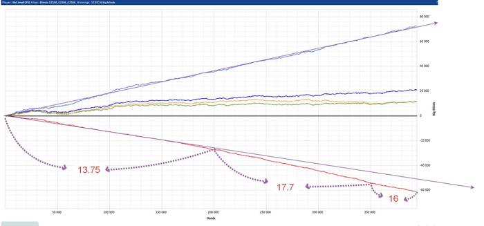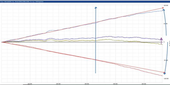 Немного по нл50.. Просел фолд на ривере очень сильно, а так же винрейт на бтн. Постоянно кулерит, даже в аповых отрезках - их поэтому и не видно, там просто схема на каждый +в кассу дает кулер. Вертикальной стрелкой отметил уход с нл100, двумя другими поменьше - разницу в линиях. Если учесть то что до этого сыграна серьезная дистация, как раз раз можно утверждать что отобрали примерно 200би (фиолетовая стрелка), стиль игры не менялся, но работа над игрой шла постоянно, так что думаю чуть больше даже. Если учесть всю эту дрянь что я вижу, я как раз и получаюсь гриндящим, жестокоселектящим регом с 2.5-3бб на сотню. Так же стало ясно что это одно и то же что было при первом сливе. Этим казиношникам настолько все равно что они просто создали вот такой пул с задранными кэфами на доез рыбы(ботов) и оценкой досок для красной линии.