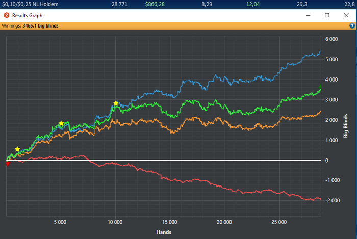 После трени я начал катать нл25 на старзах, откатал 28к рук в +8евбб, сейчас потиху перехожу на нл50: