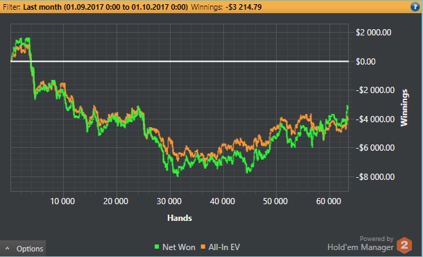 К сожалению не удалось вылезти из дикого залива. Первый минусовый месяц с прошлого августа. Но я на самом деле очень рад, что это произошло. Такие результаты отрезвляют. А то совсем не работал над игрой с апреля, и даже начали закрадываться шальные мысли, точь в точь, как в шедевральном посте xFlake. Октябрь будет посвящен теории. А в ноябре возвращаюсь на Пхукет Там планирую очень очень много катать, но это не точно)