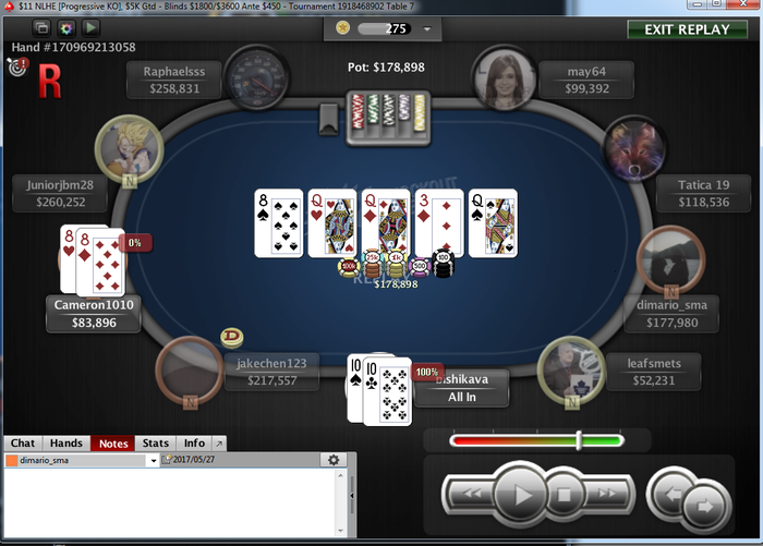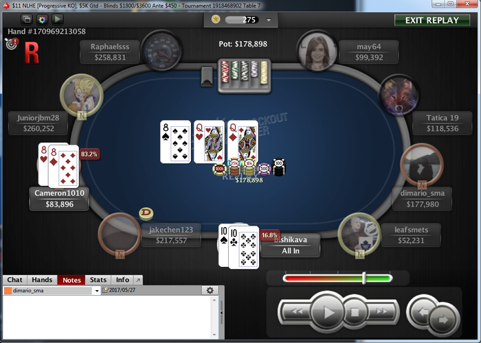 Сегодня попробовал играть загрузку. Совсем небольшую "чтобы пощупать". ИТМнул несколько, стоимость отбил. Повыносили по разному, как говорится, So/So. Где то я на грани сыграл, где то ебнули. То есть, в крайнем туре 11 PSKO 5кг играем на сегодняшний плюс сессии. Иду 12/19. Норм, контроль. И в агру через колл 4б пуша, с мертвыми от рейзера выставляемся префлоп видим прекрасную андерпару за 50бб стек. Флоп. Да ебаный насос, мыхой об стол и резко ухожу на кухню наливать чай с вкусняхами. Загасить негодование ) Через секунд десять слышу звук таймбанка. Не понял. Эхей, да мы в игре. Неужели правда ! Хотя и даже на флопе было, оказывается 17%, такие вещи воспринимаешь как ниебаццо чудо. И думаешь дочку назвать "СЮДАННА", как писал кто то на форуме. И никаких соплей, мол надо до последнего надеяться на лучшее. В итоге 8/786 и +105. JJ в KK, с коротким баунти в банке. Без вариантов.