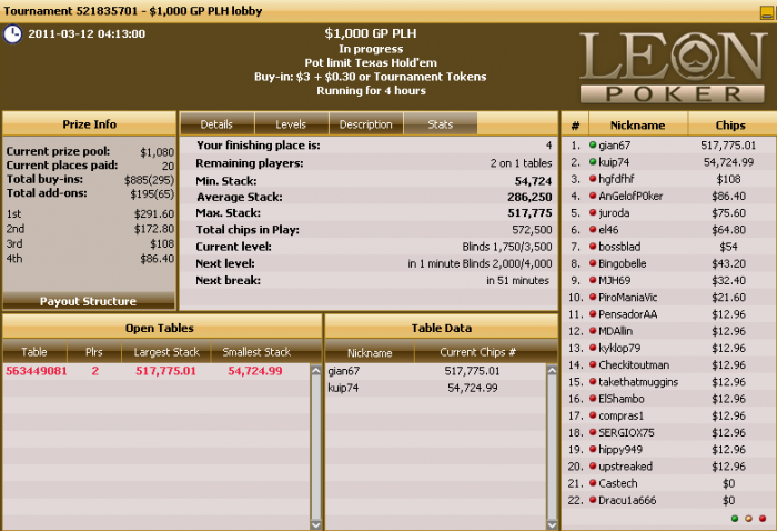 Не первый раз замечаю, что при переходе от 10-ок на 20-ки меня поджидают неприятности. Сегодняшний день не стал исключением. Обо всём по порядку. Сел настроено играть сессию, перед этим немного повозился с холдем менеджером, по крайней мере установил и в ближайшем будущем я наконец смогу выкладывать периодически раздачи на форум. Сессия была ужасна, первые десять игр отыграл в ноль, по началу действительно несколько допустил грубых ошибок и согласен с несколькими поражениями полностью. Дальше был анлак нехороший. Я долго думал после сессии на своей игрой и я знаю где были мои лики, да моя игра была не идеальна, но дело действительно было не в этом. Подсаживались несколько регов этого лимита. Один рег из Польши, как только садился начинал поливать грязью и провоцировать в чате, но по игре оказался не столь крутым, как молоть языком, играли с ним по-мойму трижды. Первая игра - почти начало я с карманными сделал 4 бет пуш и получил колл с от Поляка. Король доехал. Во второй также закончилось сравнением, АK<44...3 игру не помню. В общем конкретно по соперникам ничего страшного я не увидел, всё нормально. В этот раз невезение было не совсем обычным для меня, чаще всего в стрках просто не везёт, но тут карты не самые плохие сдавали, но оппы упорно вылезали из под всяческих доминаций или добирали, что-то на риверах. Подробности думаю ни кому не интересны, ибо все итак всё это знают. В общем сессию закончил с ужасным результатом и пошёл прогуляться и обдумать всё это дело. Посмотрел футбольный матч любимого Локо, а потом МЮ-Арсенал и вернувшись домой решил, что сегодня вместо МТТ сессии стоит отыграть ещё одну по профильным Heads Up. Чувствовал силы и желание. Только что доиграл сессию, получилась она чуть успешнее, удалось отыграть пару бай инов, но я доволен и этим. По ходу дела возникали мысли, а не вернуться ли мне на время обратно на 10-ки, но остановил себя и вспомнил, что у меня есть барьер, при котором я спущусь обратно. Пока БР выше этой отметки пытаемся зацепиться за этот лимит, не смотря на все сложности...Никто ведь и не говорил, что будет легко. А сдаваться, не в наших правилах.