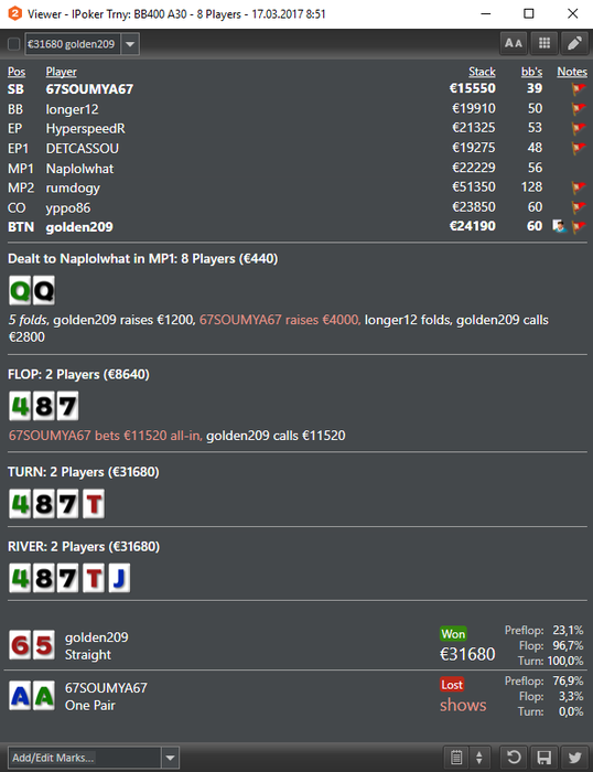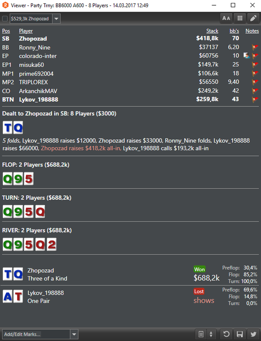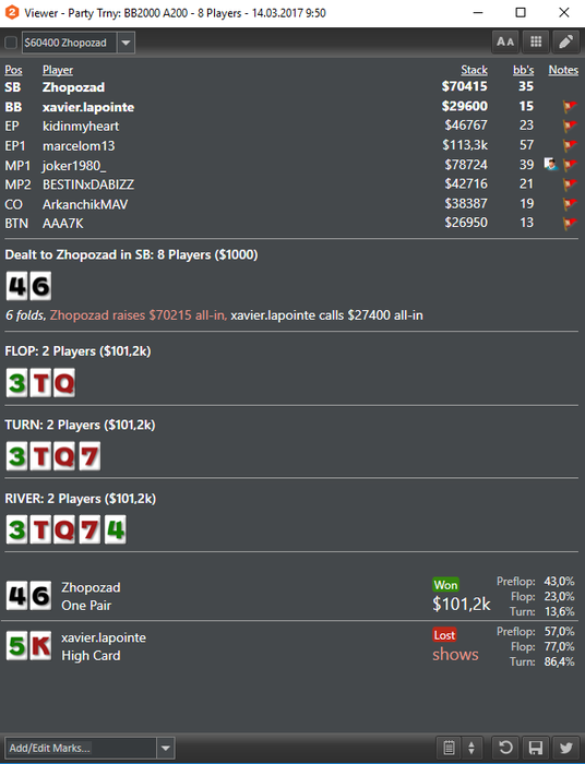 Хедз-ап вышел 18бб против 65бб, второй рукой зашли тузы, удвоился, опп очень аггресивный попался, трибетил каждую третью руку, пришлось 4бет пушить всякие 10 8, чтобы рассказать ему, что так делать не надо, блефовал в 3 барреля, много сложных решений заставлял делать, потом поплыл и отдался по ТПТК против моих двух пар. Если честно, эти турниры на микрогейминге самые потные, сначала 1.5 часа играешь 5мах и 4мах при 3ех призовых, потом еще час-полтора 3 макс и хедз-ап, и все это за 12 бай-инов низа загрузки, хрен знает, может убрать к чертовой матери эти два турнира, или заменить чем, хз.