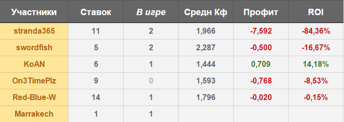 Что еще можно, можно сделать фиксированное количество ставок в день. Например 5. Следовательно каждый день будут выкладываться результаты. И по таблице будет видно кто идет впереди исходя от первого дня, где каждый поставил по 5 ставок. Это будет интересно , и будет присутствовать борьба до последнего дня. А когда у кого-то стоит уже 11 матчей, 9 матчей , а есть вообще 1. За этим наблюдать не так интересно. Ну и конечно если человек зарегался в турнирчике то нужно следовать правилам и выкладывать каждый день по 5 ставок. А когда у одного 10 ставок за 2 дня, а у другого 7. Это уже не особо честно, когда другие ждут. И в плане начала турнира можно избежать множество повторяющихся ставок.