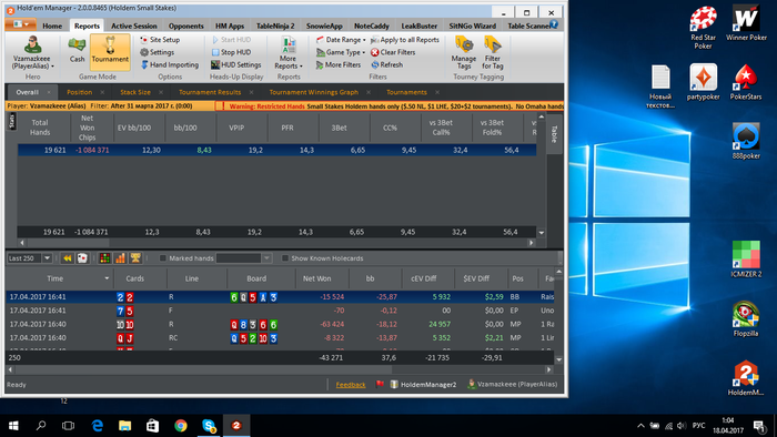Vzamazkeee @ 17.4.2017 Итак,месяц идёт тяжеловато.Ныть и плакаться я конечно же не буду,постить и рассказывать,что мне пихают) как я засаживаю всяким неадекватам,которые тупо дарят фишки а я не могу их забрать)Ведь каждый рег изо дня в день жрёт это гавно тоннами)Это никому не интересно,даже мне) Что отличает Топ-рега от обычного рега?Одно из главных отличий,как я считаю:Умение начинать каждую сессию с чистого листа,не думать и даже не держать в голове результаты прошлого дня,месяца,года,алл тайм.И после каждого бэдбита или проигранного выставления 80-20 за чип стек на пфт,не обращать на это внимание абсолютно,а просто дальше выполнять свою работу!Звучит конечно банально,но на практике всё не так просто как на бумаге. Своё психологическое состояние в этом плане оцениваю на 7/10.Нужно дотянуть до 10!Иногда всё таки могу себе позволить пробормотать себе под нос всякие гадости про оппонента)Но в чат уже давно не пишу. Работаю над игрой,убиваю в себе нита потихоньку.За столами чувствую себя уверенно,с регами воевать не боюсь. Откатал: 215мтт Профит: -500 EV