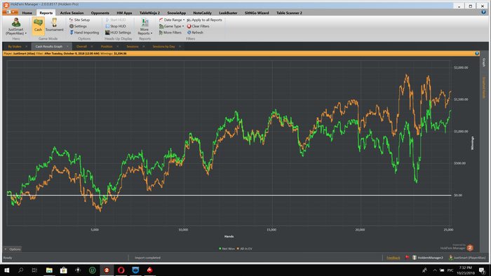 Хотя за первую неделю отыграл 20к рук. Не хватило, на мой взгляд, психологической устойчивости. На данном этапе тяжело переношу стрики (благодаря неплохому винрейту лишен удовольствия терпеть их слишком долго) и в начале второй недели, почувствовав падение качества игры, решил не продолжать. К сожалению, в покере психологическое состояние влияет слишком сильно на качество игры. Для себя я сделал вывод, что лучше сделать перерыв в пару дней, а затем еще позаниматься теорией, когда чувствуешь, что плывешь. В этот раз теория пришлась очень кстати, в последнее время казалось, что перестал прогрессировать, а сейчас за 5 дней получил ощутимый буст в видении игры, поразбирав раздачи регов нл200. На графике последние несколько тысяч раздач с качелями - это з200 и снэп 200.
