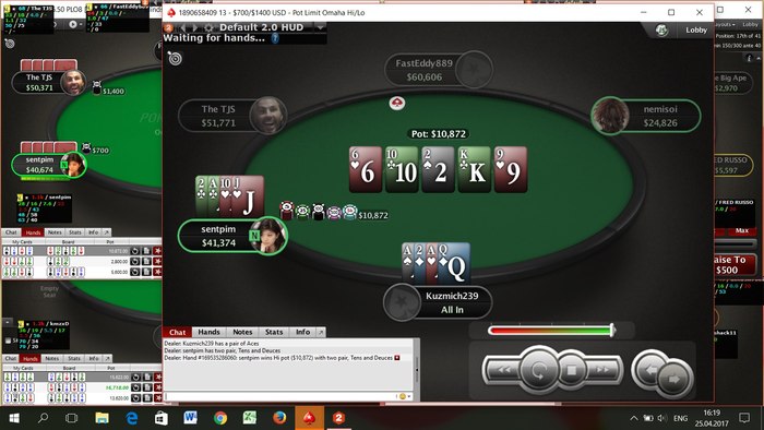 Сегодня вот баббл-бой Омании за 16$. Сначала 3 раза изолировал с баттона агроманьяка FastEddy с хорошими сбалансированными руками и ни разу даже близко во флоп не попал, а потом пришло время АА2: