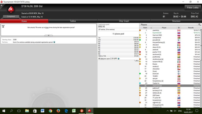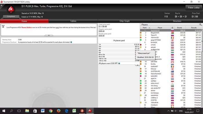 kuzmich239 @ 25.5.2017 К сожалению, пока есть возможность играть только несколько часов днем, что заметно урезает выбор турниров и уменьшает ABI, но может оно и к лучшему ибо результат говорит сам за себя.