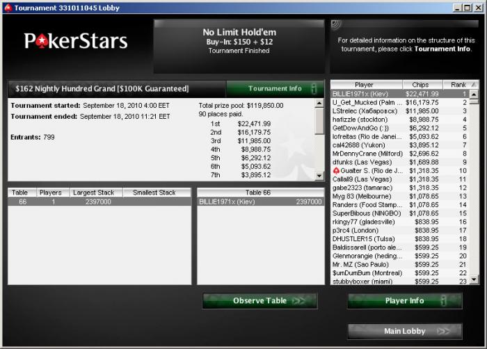 Эти килополя меня в гроб загонят, вылетел из обоих турниров в середине пейзоны. Зато есть новый ИТМ (последний на сегодня турнир), ночной фриз по 150 на Старз.