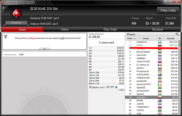 Что касается старзов, то пока нет желания там играть. Недавно снова вывел оттуда денег на поддержание жизни. Получается чуть больше чем за месяц я вывел со старзов 217 долларов. Играть там все равно придется, т.к. на покердоме норм количество столов набирается только в обед. А играть я собираюсь примерно с 10 утра. Пока все.