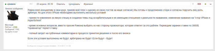 Рамон взял инициативу в свои руки, приняв мой плюс к одному из своих постов за наше согласие) Мы готовы к продолжению спора и согласны поручить ему роль арбитра. Но для этого VPluse необходимо выполнить несколько условий: