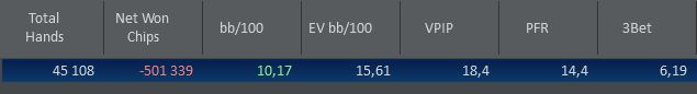 В общем-то, результатом при моём БРе я не могу быть недоволен, обидно только, что нанокаутил совсем мало. На финалке выбил двоих, но за одного дали 5 баксов, а за второго вообще два с копейками Причём пару раз за финалку раздали АА и КК, но именно в эти моменты даже парни с впипом 50-60 и фолдом на стил 10 решали инстафолдить, хотя в других ситуациях 3бетили мои опенрейзы сайзингом 15-20бб Но это уж как сложилось.