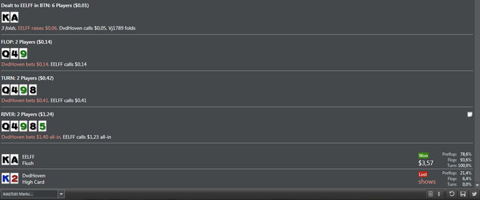 По поводу раздачи с AQ, зачем делал рейз по флопу? Зачем тебе выбивать руки слабее, в его диапазоне есть все сеты, допперы, Qx Tx, которые ты бьешь, а на рейз они выкинут, так что это плохой розыгрыш, как следствие и проигранные деньги, и кулером это никак не назовешь